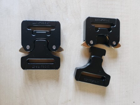 Sicherheitsschnalle aus Aluminium mit patentiertem Verschlussmechanismus. Mit ihrer unglaublichen Belastbarkeit 900 kg gehört sie zu den weltweit leistungsfähigsten Sicherheitsschnallen aus Aluminium.